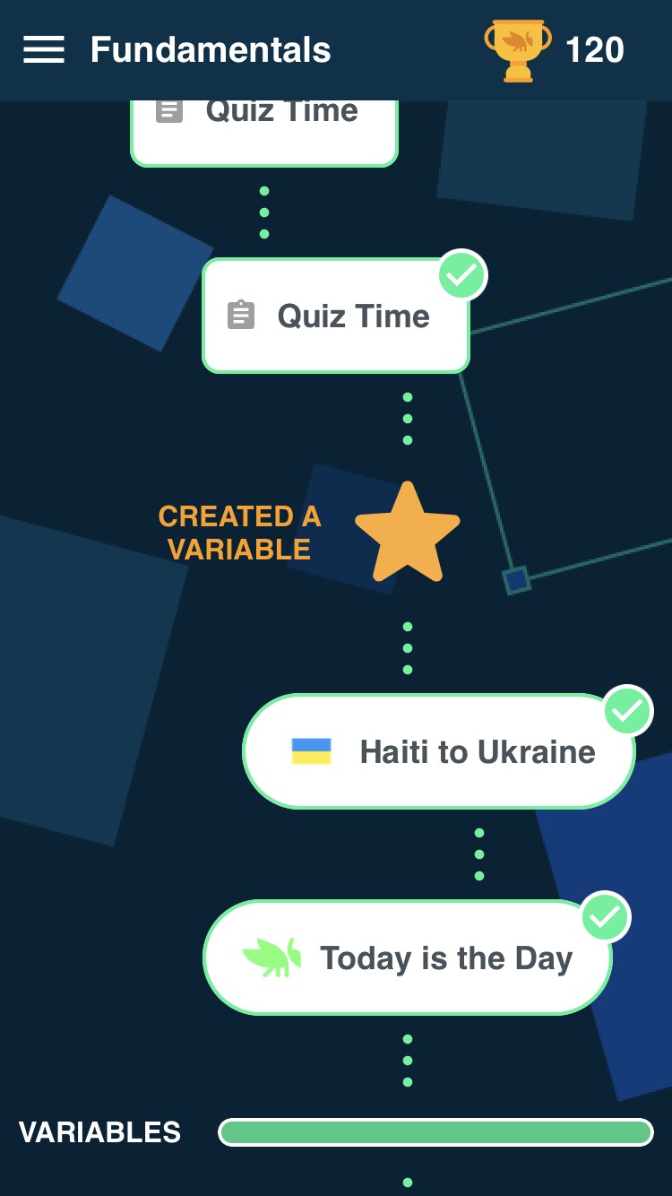 นอกจากการเขียนโปรแกรมด้วยภาษา javascript แล้ว บทเรียนต่อไปผู้เล่นจะได้เรียนรู้ เรื่องตัวแปรเก็บข้อมูล อย่าง ตัวเลข สี หรือเงื่อนไขของตัวอักษร ซึ่งผู้เล่นก็จะสามารถสร้างและแก้ไขตัวแปรได้