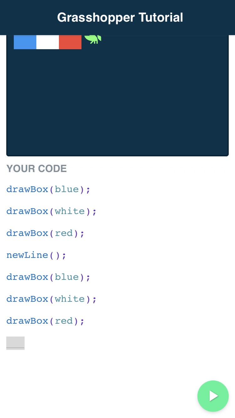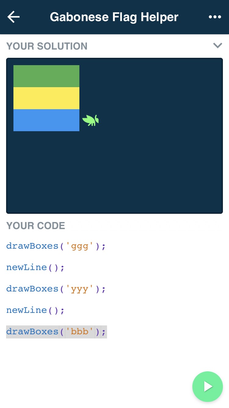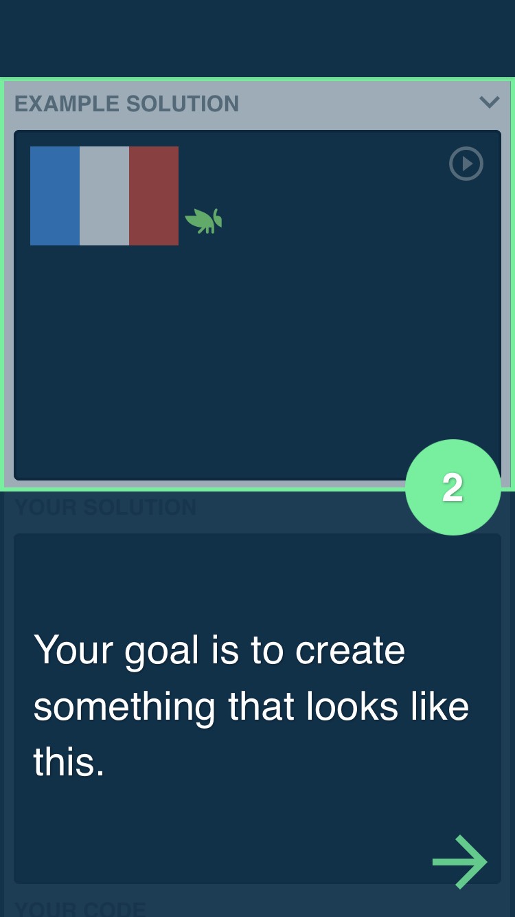 อย่างบทนี้จะเริ่มปูพื้นฐานการเขียนโปรแกรม ด้วยการให้ผู้เล่นคิดและใช้คำสั่ง ในการวาดธงชาติประเทศต่างๆ อย่างภาพแรกจะเป็นธงชาติฝรั่งเศส ผู้เล่นจะต้องเลือกใช้คำสั่งเพื่อให้การวาดธงชาติสมบูรณ์ และเพื่อให้ผู้เล่นเข้าใจวิธีเขียนโปรแกรมในบทเรียนนี้มากยิ่งขึ้น ก็ดูตัวอย่างจาก Example Solution ได้เลยค่ะ