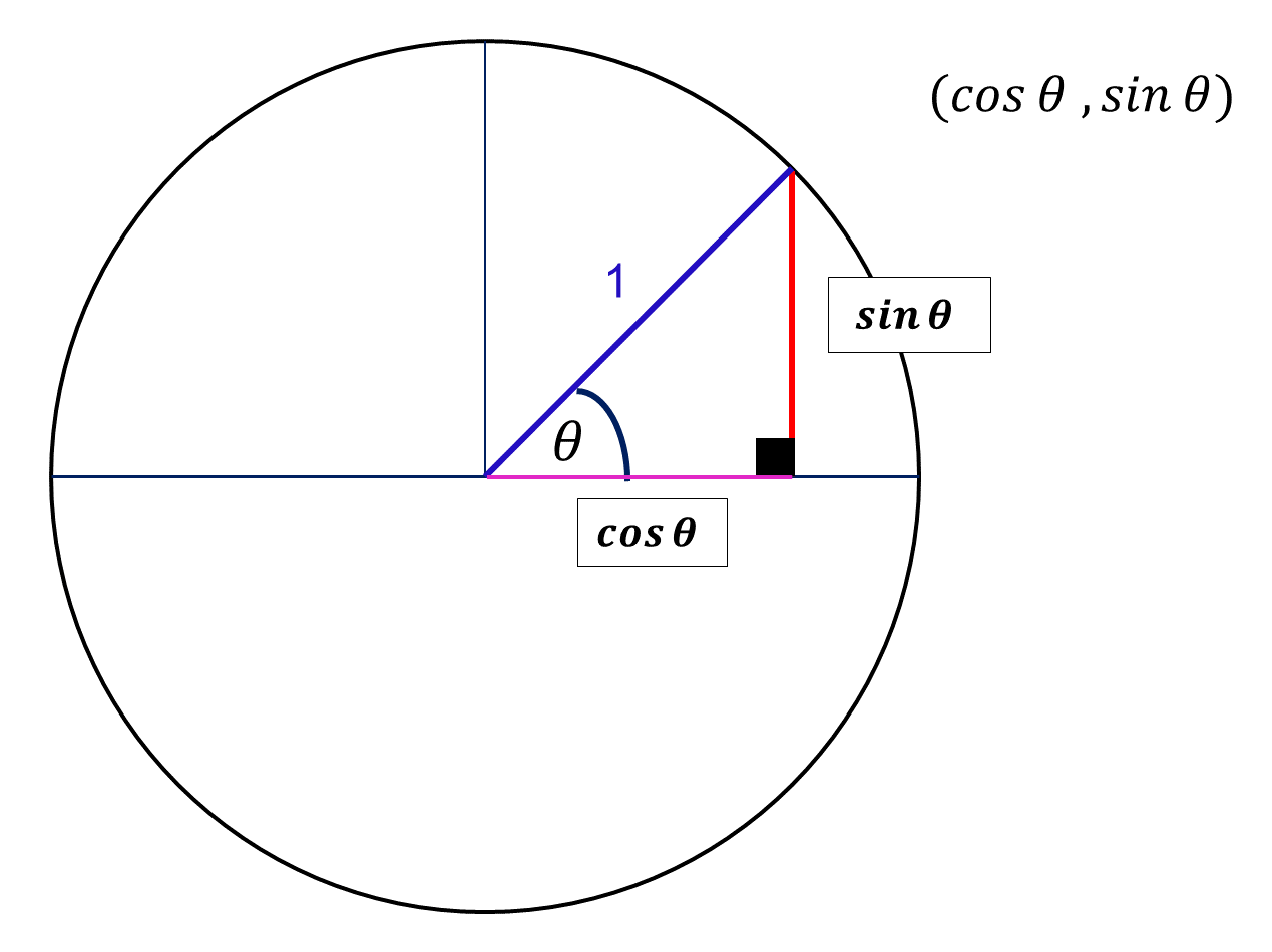 จากรูป ถ้าพี่บิวสร้างสามเหลี่ยมมุมฉากในวงกลมหนึ่งหน่วยโดยที่ด้านตรงข้ามมุมฉากมีค่าเท่ากับ 1 (รัศมีของวงกลมหนึ่งหน่วย) และด้านที่เหลือก็ล้อตามพิกัด \((cos\theta ,sin\theta)\) โดยที่ \(cos\theta\) อยู่แกน \(x\) และ \(sin\theta\) อยู่แกน \(y\)