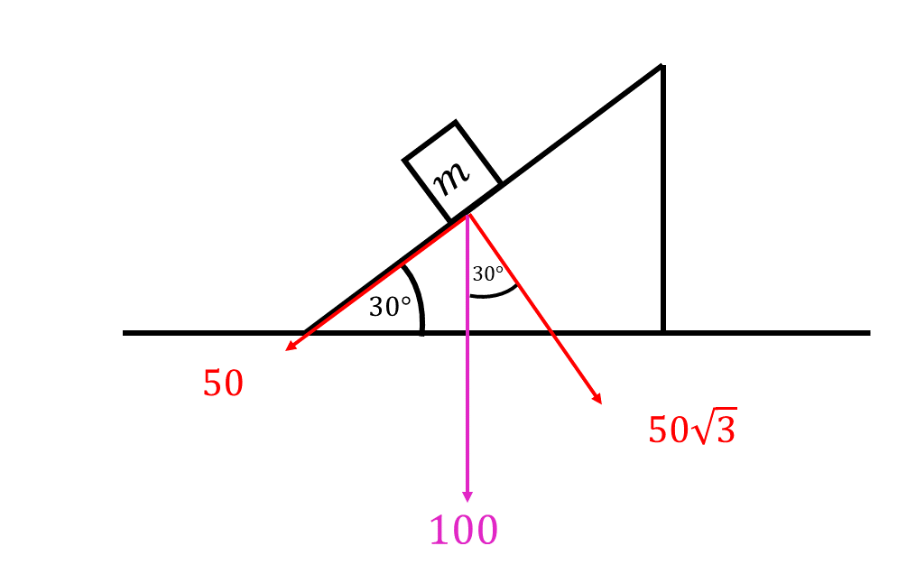 ดังนั้น \(mgcos\theta\) จะได้ \(10(10)cos30^\circ = 10(10)(\frac{\sqrt{3}}{2}) = 50\sqrt{3}\)