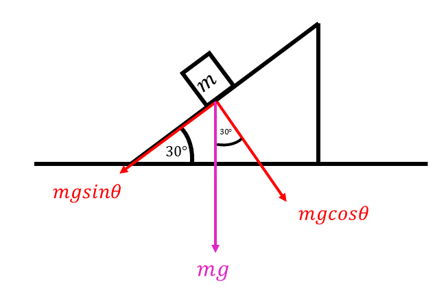 เอาล่ะ เมื่อได้ทุกอย่างพร้อมแล้ว เรามาแตกแรงกันดีกว่า เส้นสีแดงด้านขวาคือเส้นที่อยู่ใกล้มุม เราจะแตกได้เป็น \(mgcos\theta\) และเส้นสีแดงด้านซ้ายซึ่งอยู่ไกลมุมเราจะแตกได้เป็น \(mgsin\theta\)