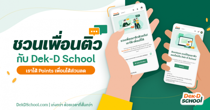 ติวแล้วชอบ เรียนแล้วตอบโจทย์ คะแนนดีขึ้น มาชวนเพื่อนติวออนไลน์กับ Dek-D School กัน! เพียงส่งลิงก์ชวนเพื่อน เพื่อนจะได้รับส่วนลดทันที 5% สูงสุด 200 บาท สำหรับการซื้อคอร์สครั้งแรกกับ Dek-D School โดยสามารถใช้ส่วนลดได้กับทุกคอร์ส