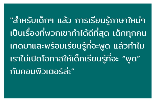 “เมื่อใดก็ตามที่คนในสังคมมีมุมมองที่ถูกต้องในการเขียนโปรแกรม มันจะไม่ใช่เรื่องน่าประหลาดใจเลยที่จะให้เด็กเรียนรู้เรื่องนี้ เพราะการเขียนโปรแกรมคอมพิวเตอร์มันก็คือการสื่อสารนั่นเอง หมายความว่ามนุษย์สื่อสารกับคอมพิวเตอร์ด้วยภาษาที่ต่างฝ่ายต่างเข้าใจซึ่งกันและกัน และสำหรับเด็กๆ แล้ว การเรียนรู้ภาษาใหม่ๆ เป็นเรื่องที่พวกเขาทำได้ดีที่สุด เด็กทุกคนเกิดมาและพร้อมเรียนรู้ที่จะพูด แล้วทำไมเราไม่เปิดโอกาสให้เด็กเรียนรู้ที่จะ “พูด” กับคอมพิวเตอร์ล่ะ”