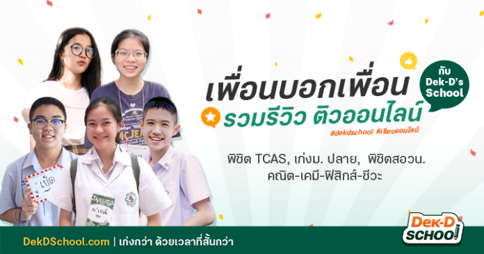 รีวิวการเพื่อนๆ การันตีว่าติวออนไลน์กับ Dek-D School เข้าใจง่าย ไม่เน้นท่องจำ เวลาจำกัดก็เรียนได้ แถมมีโจทย์ให้ฝึกเพียบ คะแนนดีขึ้นกันขนาดนี้ ถ้าไม่อยากพลาดโอกาสดีๆ ในการพิชิตคะแนนสอบที่หวังไว้ สมัครติวออนไลน์กับ Dek-D School ได้เลย