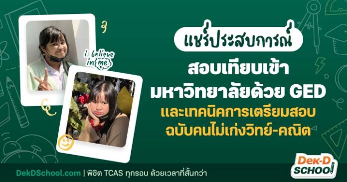 มีน้องๆ หลายคนเริ่มสนใจการสอบเทียบด้วย หลักสูตร GED เพราะการสอบเทียบด้วยหลักสูตรนี้จะทำให้น้องๆ ได้วุฒิม.6 และที่สำคัญน้องๆ สามารถนำวุฒินี้ไปใช้สอบเข้าต่อในระบบ TCAS ได้ด้วย หลักสูตร GED เป็นอย่างไร ต้องสอบอะไรบ้าง สามารถนำวุฒิไปสอบ TCAS ได้ยังไง วันนี้พี่เค้กจะมาแชร์ประสบการณ์จริงการสอบ GED อย่างละเอียด และการเตรียมสอบ TCAS ฉบับคนที่ไม่เก่งวิชาวิทย์ คณิต จนสามารถพิชิตคณะในฝันได้สำเร็จ จะเป็นยังไงไปติดตามได้เลยค่ะ