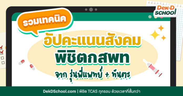 ขอบอกก่อนว่าผมเป็นคนขี้เกียจไม่ค่อยชอบวิชาท่องจำโดยเฉพาะวิชาที่คิดว่าเราคงไม่ได้เอาไปใช้อะไร เช่นวิชาสังคม 🙂 555 ทำให้ตอนเรียนวิชาสังคมในมัธยม เป็นการเรียนเพื่อให้ผ่านๆไป พอจะเอามาใช้เลยจำเนื้อหาอะไรไม่ได้เลย :::( ผมเริ่มมาเตรียมตัวเรียนวิชาสังคมตอนประมาณ 4เดือนก่อนสอบ หลังจากที่เก็บวิชาอื่นพอได้แล้ว และตอนนั้นได้ไปลองสอบสังคมของ Dek-D’s Pre-Admission ได้คะแนนสังคมแค่ 30 คะแนน ตอนนั้นก็เลยเริ่มแบ่งเวลามาเรียนสังคมของ Dek D School กับอาจารย์กนก ที่เลือกเรียนสังคมกับอาจารย์กนกก็เพราะว่า อ.กนกสอนสังคมม.ปลาย ที่โรงเรียนสาธิตจุฬาฯ ซึ่งนักเรียนทุกคนก็ต่างรู้กันดีอยู่แล้วว่าอาจารย์กนกสอนเนื้อหาได้ละเอียด เนื้อหาครบ สอนสนุก ไม่น่าเบื่อ สอนเก่ง แถมดุด้วย:) บวกกับราคาคอร์สของ Dek D School ราคาไม่แพงด้วย ก็เลยตัดสินใจเลือก คอร์สพิชิต TCAS สังคมศึกษา A-Level – ครบทุกบท กับ Dek D School ส่วนการเตรียมสอบเริ่มจากเก็บเนื้อหาสังคมในส่วนเนื้อหาที่ควรจำได้ เช่น กฎหมาย เศรษฐศาสตร์ หน้าที่พลเมือง ภูมิศาสตร์ ส่วนประวัติศาสตร์กับศาสนา ก็อ่านเท่าที่อ่านไหว อย่างของผมก็จะเน้นเตรียมเนื้อหา กฎหมาย เศรษฐศาสตร์ หน้าที่พลเมือง เช่น กฎหมายมรดก เพราะว่าเนื้อหาพวกนี้ใช้ความจำไม่เยอะมากเท่ากับศาสนา ใช้ความเข้าใจบ้าง ใช้ common sense บ้าง ทำให้เนื้อหาส่วนนี้คุ้มค่าที่จะเรียนมากๆ หรืออยากอ่าน แชร์ประสบการณ์ 1 ปีก่อนสอบหมอ และ ทริคพิชิตคะแนนสังคม ใน 4 เดือน จากพี่ชวาล คลิกเลย