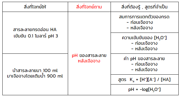 ส่วนสูตรการหาค่า Ka กับค่า pH น้องๆ สามารถดูได้จากในตารางข้างบน ต่อไปเราจะมาเริ่มวิเคราะห์โจทย์กัน