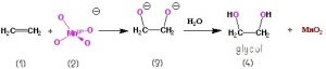 จากภาพเราจะเห็นว่าหลังจากที่ Alkene (1) ทำปฎิกิริยากับโพเเทสเซียมเปอร์เเมงกาเนต (2) จะได้โครงสร้างเป็น สมการที่ (3) จากโครงสร้างจะพบว่า O มีประจุลบซึ่งไม่เสถียร เมื่อทำปฏิกิริยากับน้ำโดยน้ำจะเเตกตัวเป็น H ที่มีประจุบวกเลยเข้าจับกับ O ได้ง่ายกว่าที่จะเข้าไปเเทนที่ในโครงสร้างหลักเพราะ C มี 4 เเขนเเละถูกใช้ครบเเล้ว