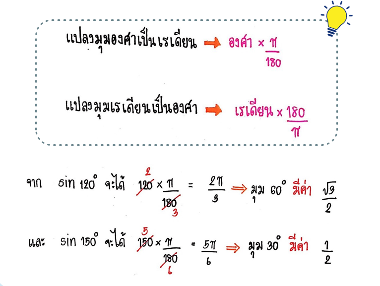 จากวิธีทำที่ผ่านมา น้องๆ บางคนอาจจะสงสัยว่า มุม 120° กลายเป็นมุม 60° และมุม 150° กลายเป็นมุม 30° ได้อย่างไร?