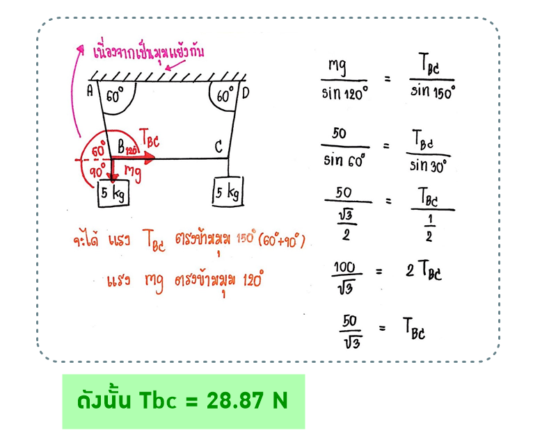 จะเห็นว่า แรงตึงเชือก Tbc อยู่ตรงข้ามกับมุม 150° (เกิดจาก มุม 60°ซึ่งเป็นมุมแย้ง + มุมตั้งฉาก 90° ด้านล่าง)
