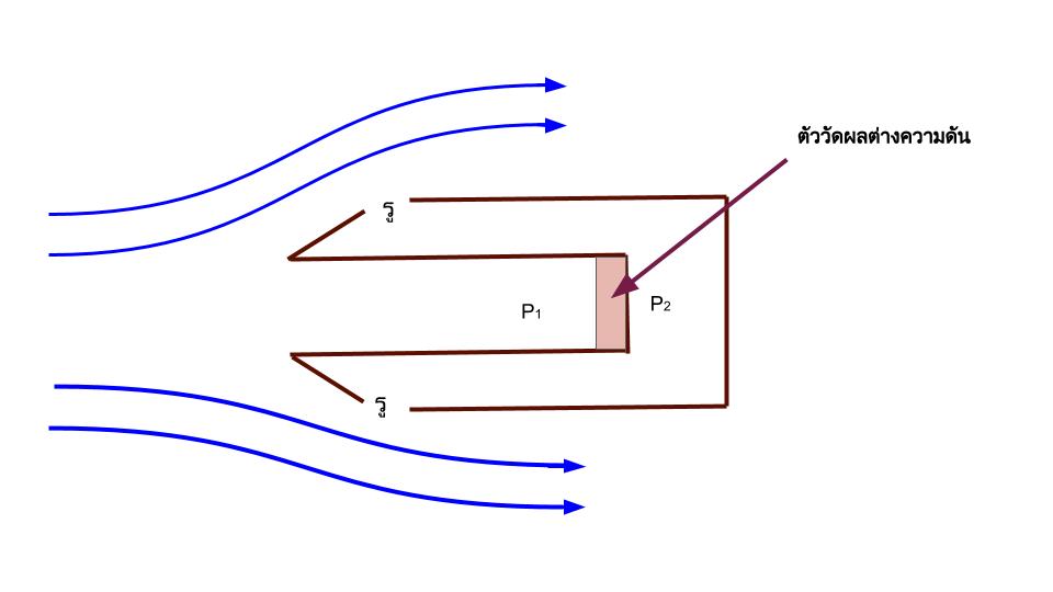 หลอดไพทอทที่ติดอยู่บนลำตัวเครื่องบินมีลักษณะเป็นท่อปลายแหลม ใช้วัดอัตราเร็วของอากาศเทียบกับเครื่องบิน หลอดดังกล่าวประกอบด้วยท่อทรงกระบอกสองอันซ้อนกัน โดยปลายด้านหน้าเชื่อมติดกันเป็นปลายแหลมและเจาะรูที่ทรงกระบอกนอกดังรูป เมื่อเครื่องบินเคลื่อนที่ อากาศจะไหลเข้าปะทะปลายท่อและเบนออกไปด้านข้างผ่านรูที่เจาะไว้(แต่ไม่ได้เข้าไปในรู) ดังนั้นอากาศที่บริเวณ \(P_1\) และ \(P_2\) จึงเป็นอากาศที่นิ่งแต่มีค่าแตกต่างกัน ที่ปลายทรงกระบอกตัวในติดตั้งตัววัดผลต่างความดันไว้ซึ่งใช้คำนวณหาอัตราเร็วของอากาศ