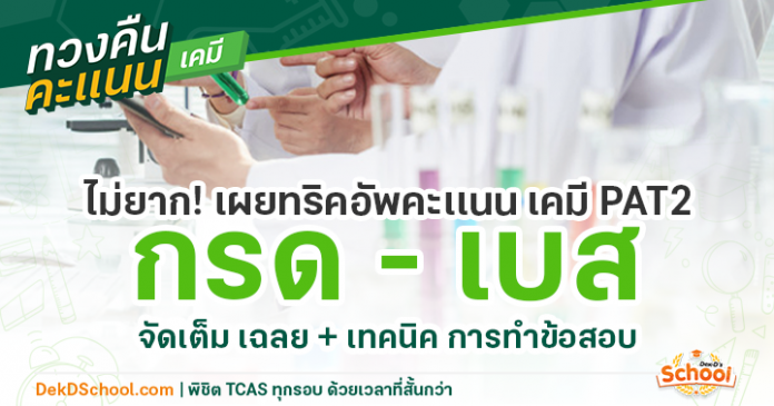 ช่วงการสอบ TCAS63 กำลังใกล้เข้ามาอีกเเล้วปีนี้ตารางสอบ GAT/PAT คือช่วงต้นเดือนมีนาคมเลยเเต่ !!! ก็ยังดีใจไม่ได้นะคะเพราะเวลาผ่านไปไวยิ่งช่วงสิ้นปีที่วันหยุดเยอะๆ เเบบนี้รู้ตัวอีกที่ก็ใกล้สอบเเล้ว อ.เต้ Dek-D School เลยจับเอาตัวอย่างข้อสอบ เคมี PAT2 ในเรื่องที่ออกทุกปีอย่าง กรด – เบส มาเฉลยเเบบละเอียดพร้อมเทคนิคการทำข้อสอบเเบบมือโปรมาให้น้องๆ ได้ลองฝึกฝนกันค่า ^^